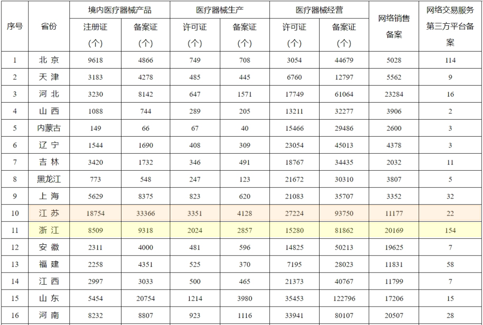 产品注册证数量排名前3: 江 苏、广 东、湖 南