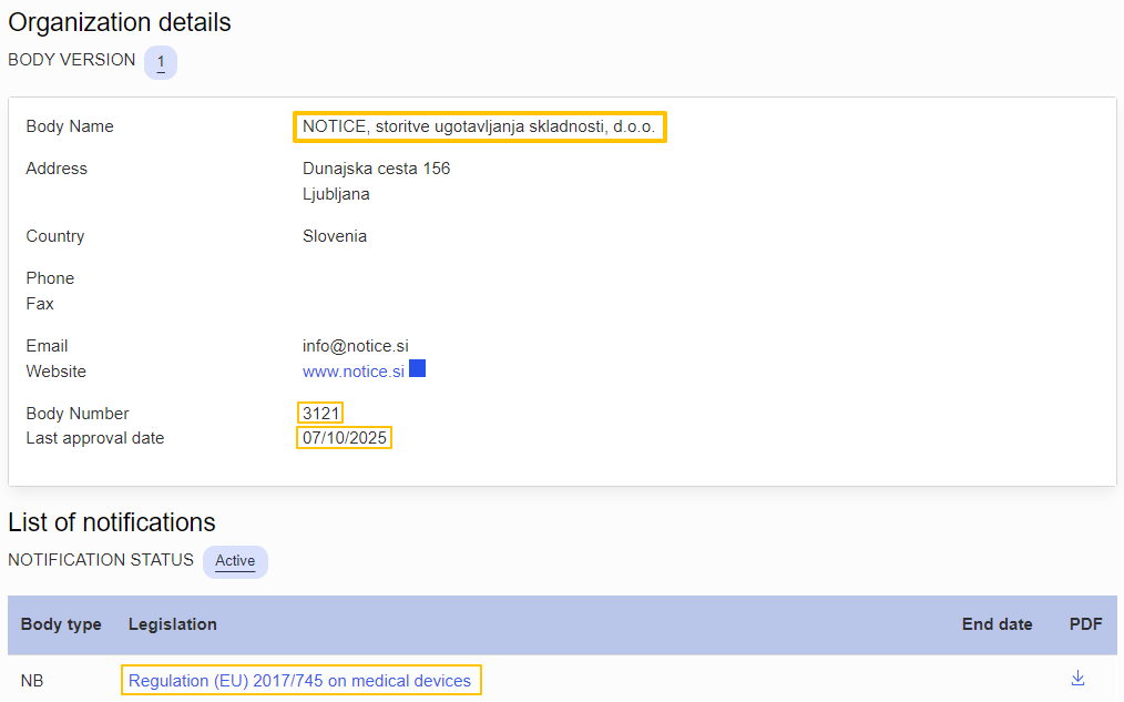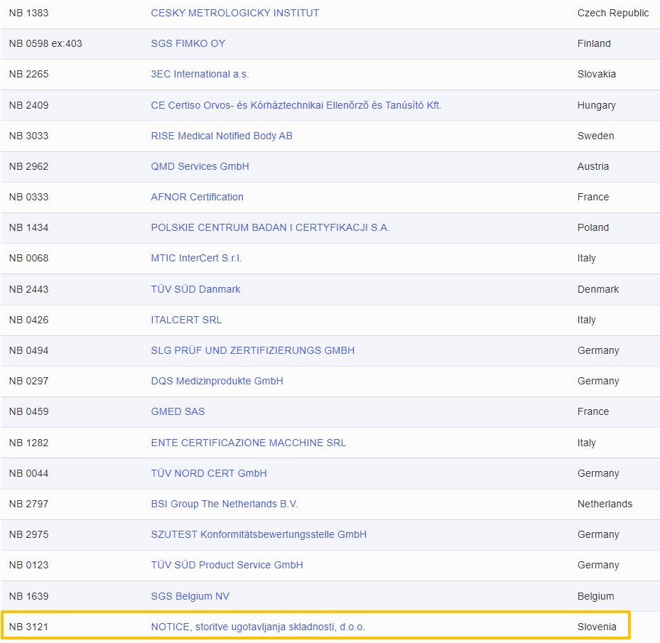 Notice d.o.o.被正式指定为具备欧盟MDR法规审核资质的CE发证机构,全称为 NOTICE,storitve ugotavljanja skladnosti,d.o.o.,公告机构号3121,现已获得授权可根据法规(EU)2017/745为医疗器械提供符合性评估服务。