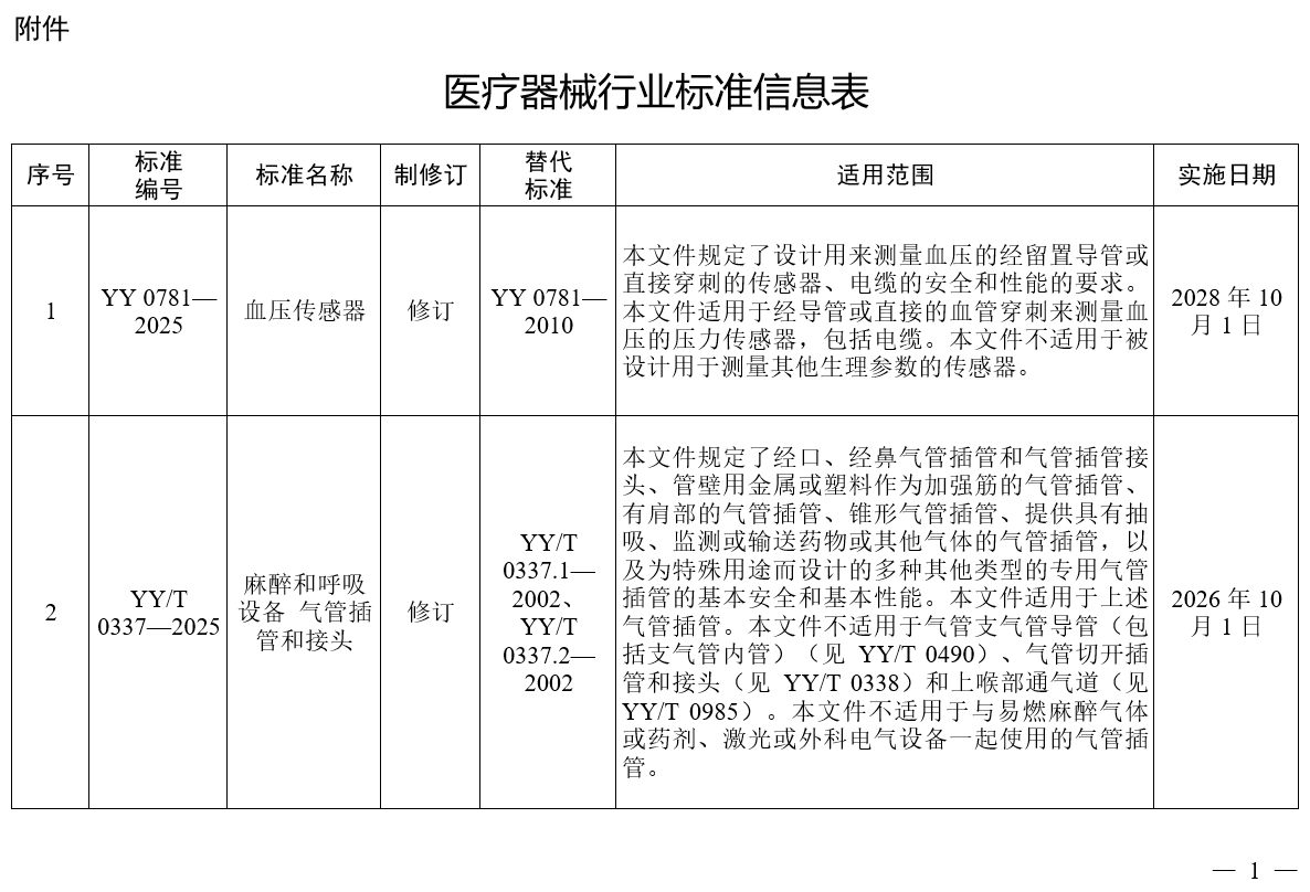 国家药监局关于发布YY 0781—2025《血压传感器》等15项医疗器械行业标准的公告(2025年第92号):