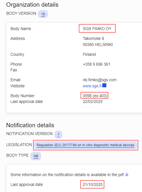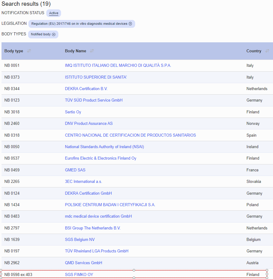 第19家欧盟IVDR审核公告机构新鲜出炉:SGS FIMKO OY,公告机构号0598 (ex:403) ,是继SGS Belgium NV(公告机构号1639)之后SGS第二家IVDR公告机构,也是芬兰第3家IVDR公告机构,并跻身MDR和IVDR双重发证资质机构队列。