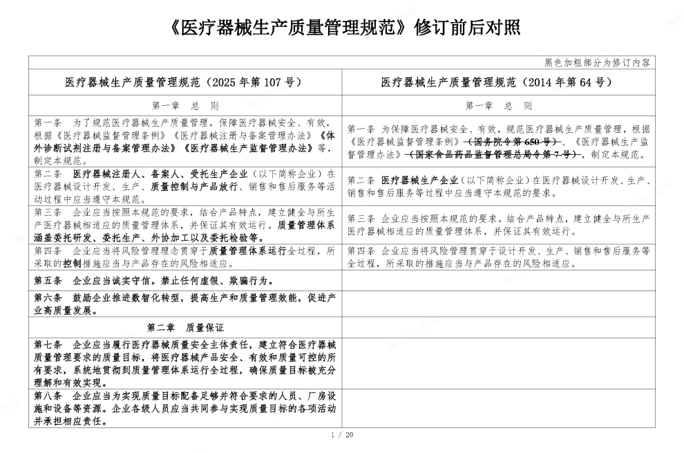 国家药监局于2025年11月4日在官网发布《医疗器械生产质量管理规范》。为方便大家了解新修订《医疗器械生产质量管理规范》的主要变化,核查中心组织对《医疗器械生产质量管理规范》修改前后进行了对比。