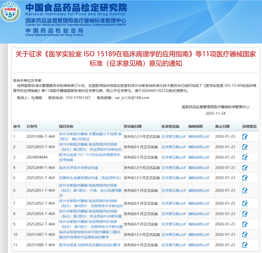 按照国家标准化管理委员会标准制修订计划,全国医用临床检验实验室和体外诊断系统标准化技术委员会已组织完成了《医学实验室 ISO 15189在临床病理学的应用指南》等11项医疗器械国家标准的征求意见稿,现公开征求意见。请于2026年01月23日前反馈意见。