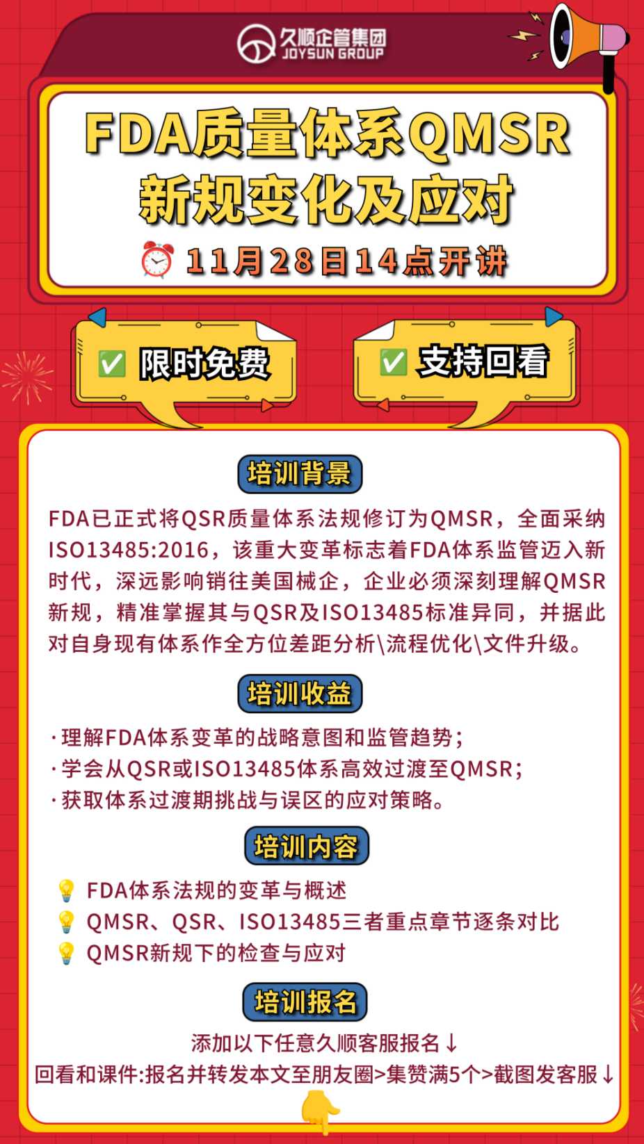 培训报名仅剩2天|久顺名师教你无缝切换FDA体系新规QMSR
