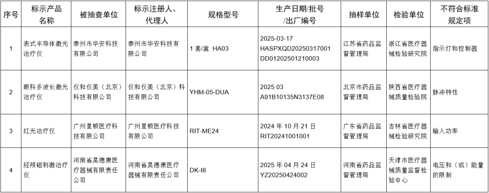 为加强医疗器械监督管理,保障医疗器械产品质量安全有效,国家药品监督管理局组织对半导体激光治疗机、聚氨酯泡沫敷料等11个品种进行了产品质量监督抽检,有15批(台)产品不符合标准规定。具体情况通告如下: