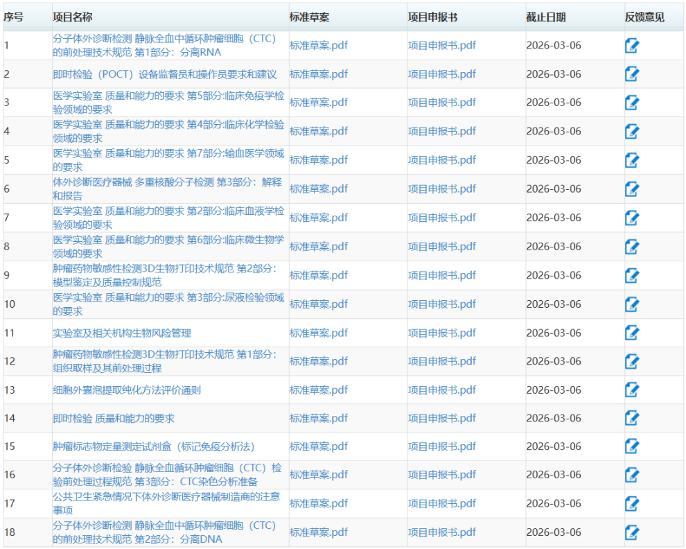 按照《医疗器械标准管理办法》《医疗器械标准制修订工作管理规范》的要求,全国医用临床检验实验室和体外诊断系统标准化技术委员会对《分子体外诊断检测 静脉全血中循环肿瘤细胞(CTC)的前处理技术规范 第1部分:分离RNA》等18项医疗器械国家标准立项申请项目公开征求意见。请于2026年03月06日前反馈意见。