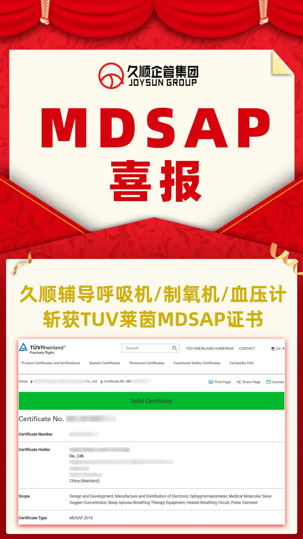 久顺喜报:辅导呼吸机、制氧机、血压计多项产品斩获MDSAP证书!