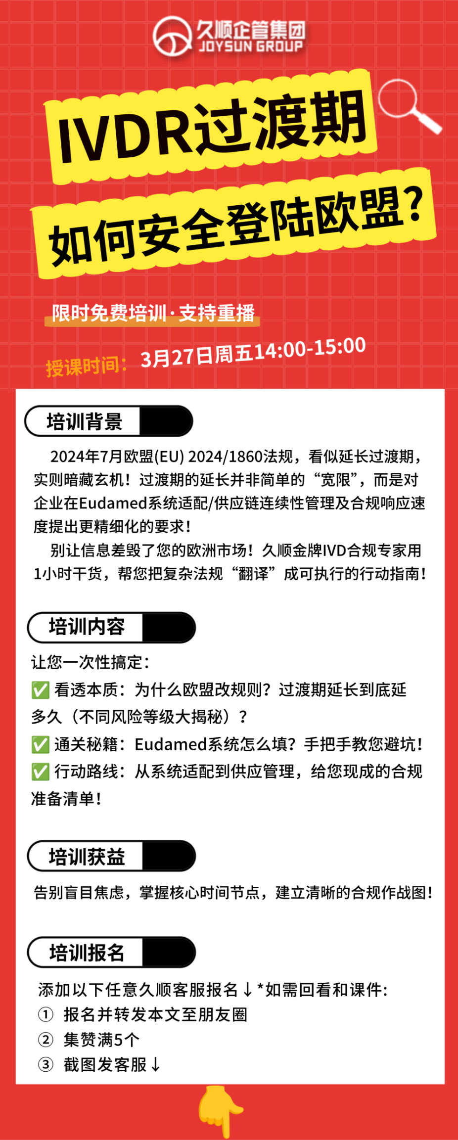 别让信息差毁了您的欧洲市场!久顺金牌IVD合规专家,用1小时干货,帮您把复杂的法规“翻译”成可执行的行动指南!