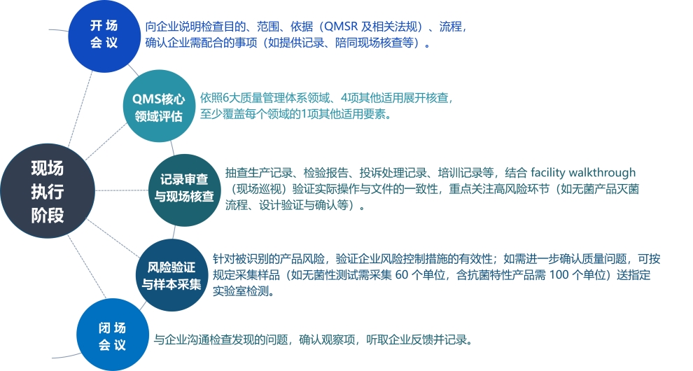 为聚焦风险并反映质量管理体系各流程之间的关系,《以风险为基础的检查流程》(如下图所示)将QMSR要求归纳为6大质量管理体系领域、4项其他适用的FDA要求: