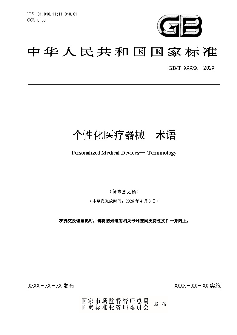 国家标准计划《个性化医疗器械 术语》由SAC/TC221(全国医疗器械质量管理和通用要求标准化技术委员会)归口上报及执行,主管部门为国家药品监督管理局。