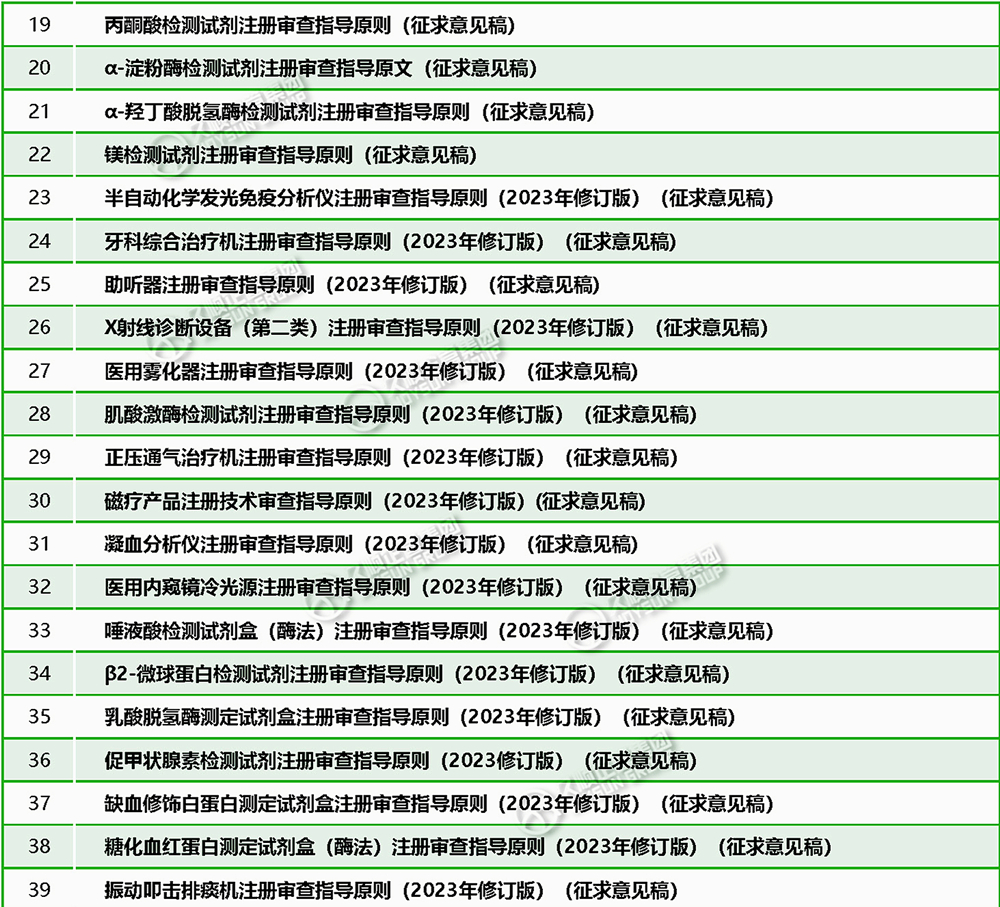 10月24日,国家药品监督管理局医疗器械技术审评中心发布通知:根据国家药品监督管理局医疗器械注册审查指导原则项目计划的有关要求,中心组织编制了《电动摄影平床注册审查指导原则(征求意见稿)》等54项第二类指导原则,现已形成征求意见稿,即日起在网上公开征求意见。如有意见和建议,请填写意见反馈表,并于2023年11月23日前反馈至相应的联系人。