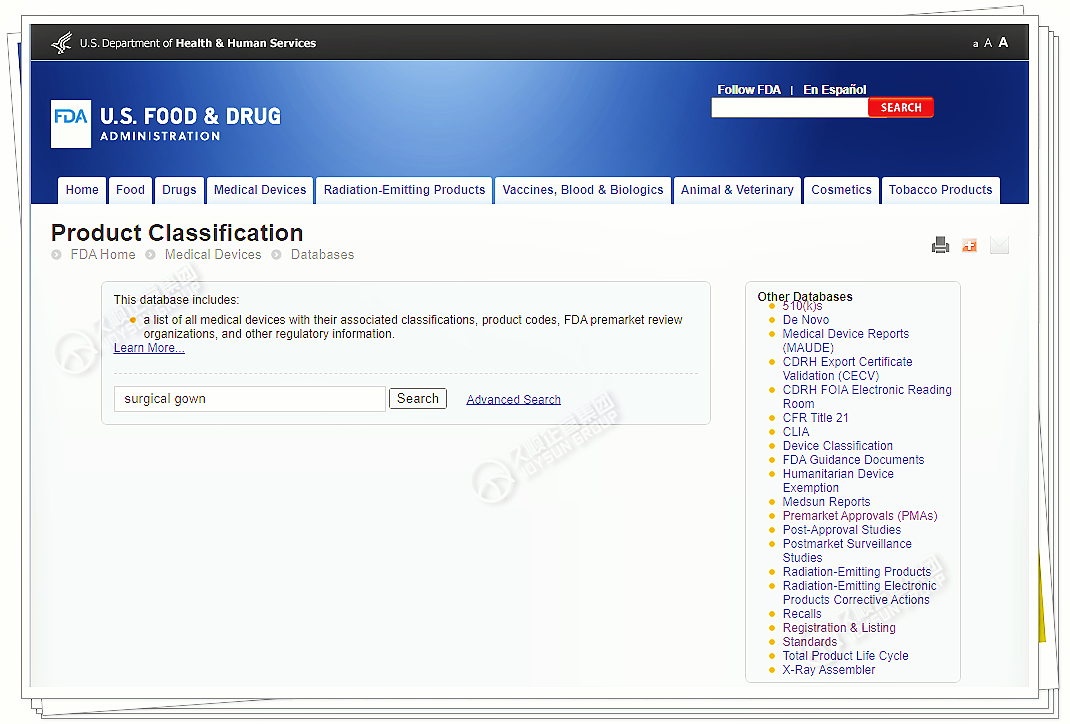 1.首先在FDA官网右上角的“Search”中输入“Medical Device Database”。