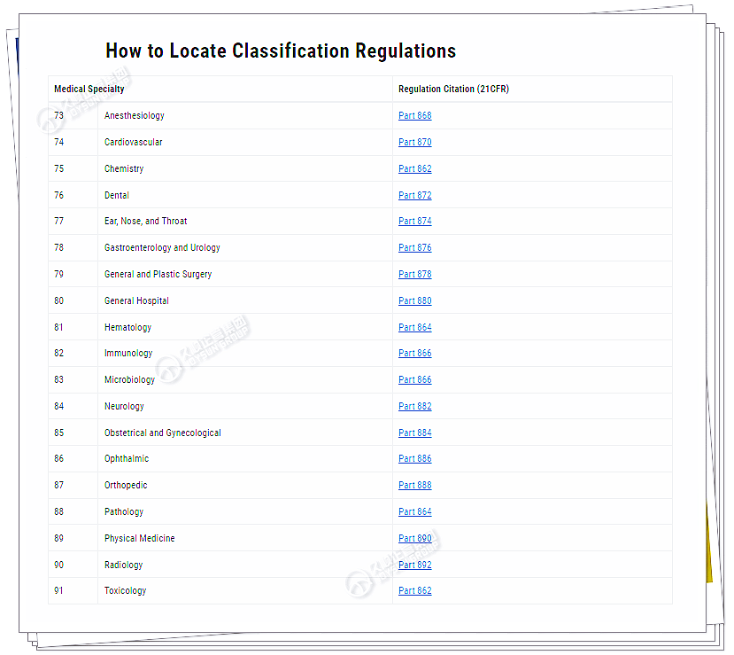 ① 首先,可查看FDA的医疗器械分类面板(根据医疗专业划分的医疗器械类别列表)。