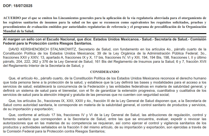 近日,墨西哥联邦官方公报:发布《卫生用品卫生注册简化监管途径通用指南》,承认参考监管机构和世界卫生组织预认证计划所出具的要求、测试和评估程序的等效性,旨在通过承认其他监管机构的决定,加速简化卫生用品(含医疗器械)的注册流程。