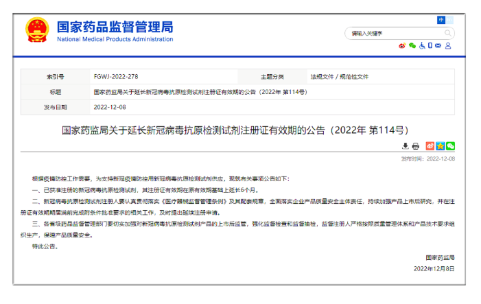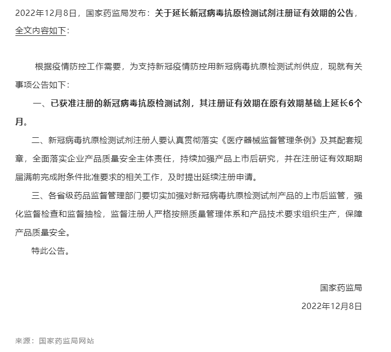 国家药监局发文:新冠抗原检测试剂注册证有效期延长6个月!