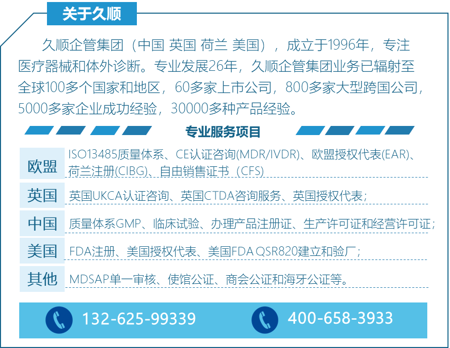 >>敬请联络【久顺企管】近30年全球合规技术专家,擅长产品注册、临床研究与临床评价、生产许可证、经营许可证、质量体系GMP等项目与服务,具备优厚的咨询管理和技术服务经验及能力,深耕无菌、非无菌、植入、有源、体外诊断等医疗器械领域,中国\荷兰\美国\英国均设公司,护航产品畅行全球。